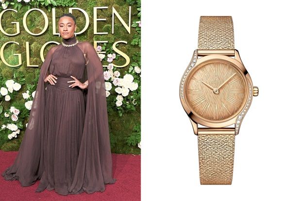 Nominated for the Best Performance by an Actress in a Motion Picture – Drama for her role in Babygirl, the Omega ambassador completes her Glam Goddess look with a rare Art Nouveau timepiece from 1920. Crafted with the curves and arabesque decoration of the period, the fantasy platinum case is set with 24 brilliant-cut diamonds and is worn on a black fabric bracelet.