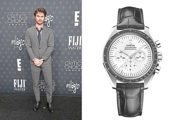 Omega’s friend of the brand, Chase Stokes, who appears in the Netflix drama Outer Banks, wears a Speedmaster Moonwatch in 18K Canopus Gold on a black leather strap.
