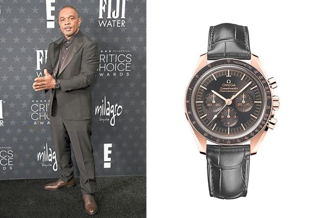 Nominated for the Best Supporting Actor award for his role in Sing Sing, Clarence Maclin wears a Speedmaster Moonwatch in 18K Sedna Gold on a black leather strap.