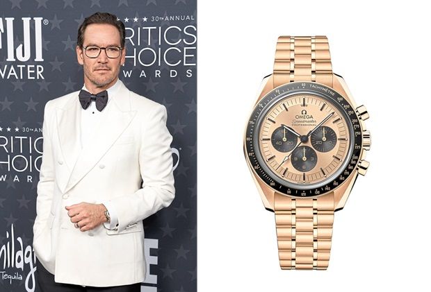 Actor Mark Paul Gosselaar sports a Speedmaster Moonwatch with case and bracelet in 18K Moonshine Gold.