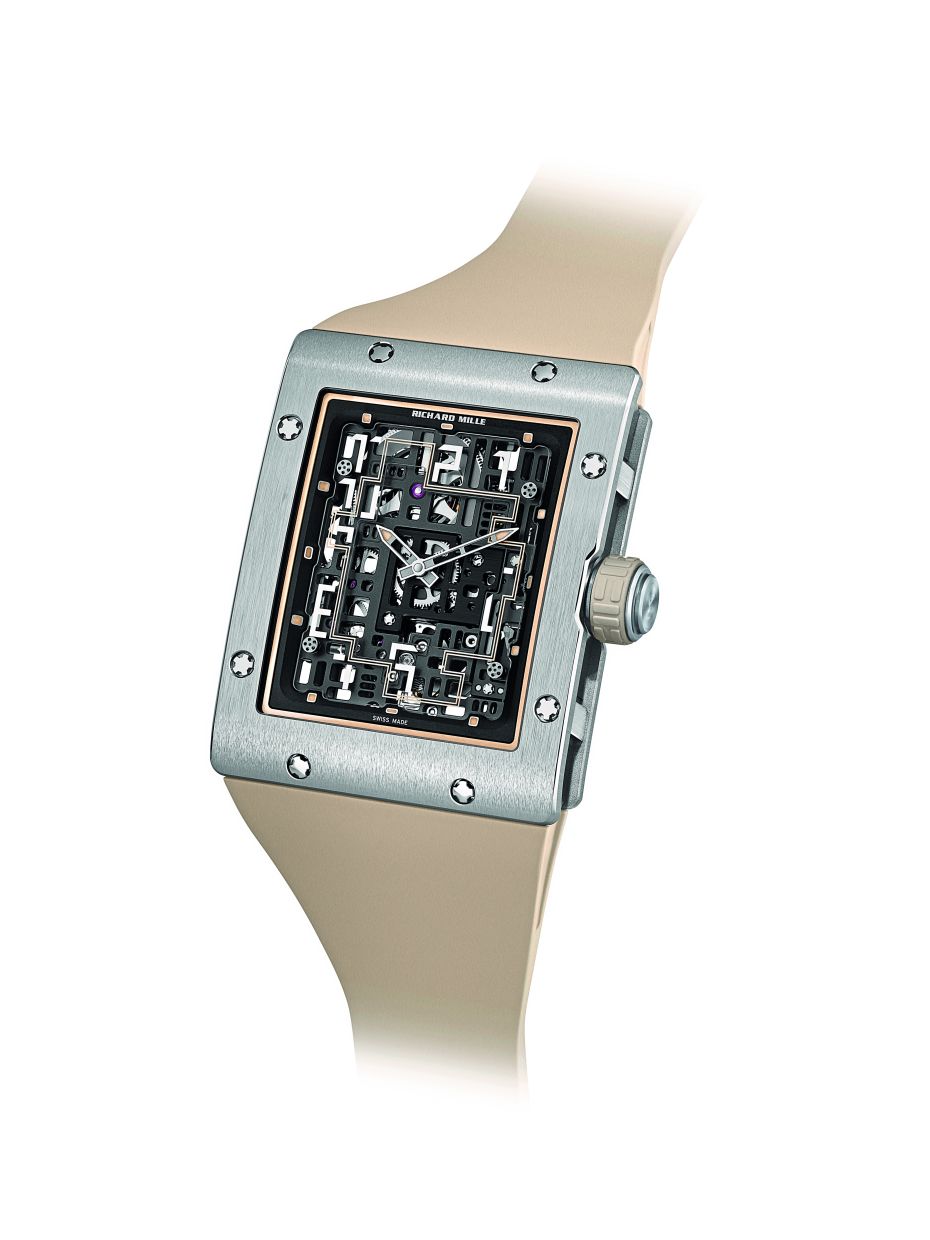 Richard Mille's movement engineers designed this tangle of titanium to maximise the entrance of light thanks to the cutaways of its openworked elements.