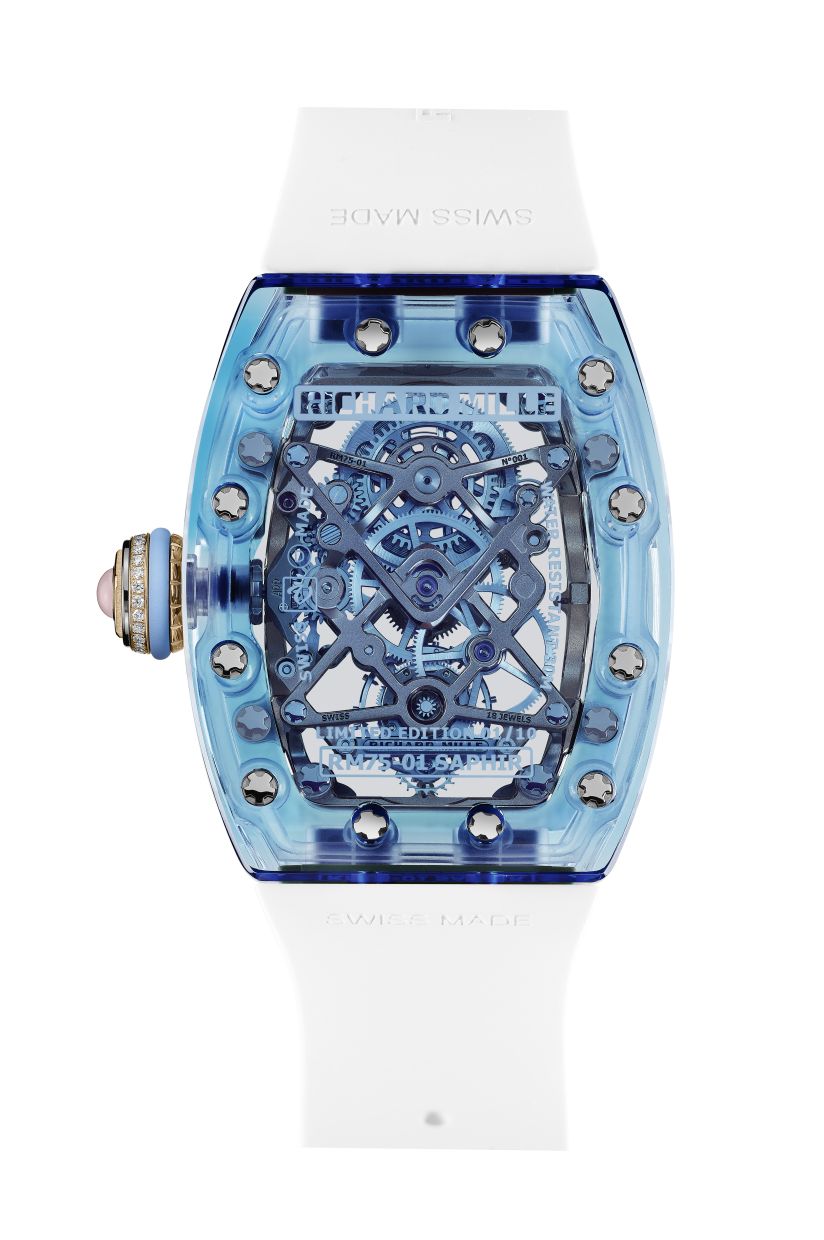 Each variation of the RM 75-01 Flying Tourbillon Sapphire possesses a unique hue evoking a specific seascape and atmosphere. — Photos: Richard Mille