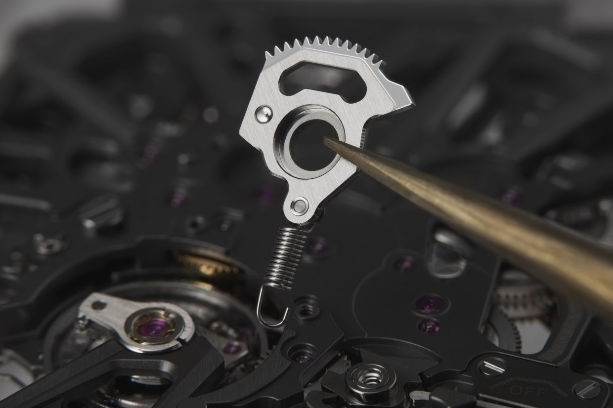 In shifting between the normal mode that winds the barrel spring to the "sports mode" that suspends the rotor’s activity, pressure on the push-piece prompts the function to deliver haptic feedback, allowing the wearer to actually feel the weight segments springing apart on their wrist.