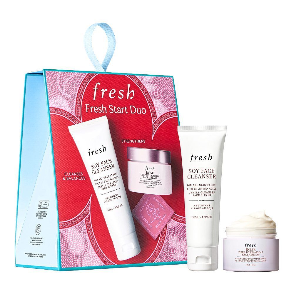 Fresh’s Fresh Start Duo (Holiday Limited Edition) includes products in travel sizes: Soy Face Cleanser and Rose Deep Hydration Face Cream.