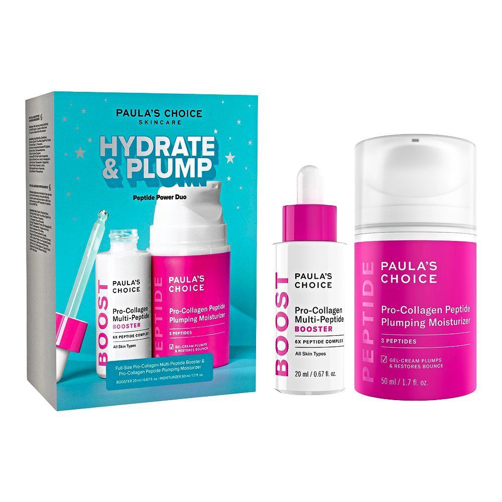The Hydrate & Plump Peptide Power Duo (Holiday Limited Edition) from Paula’s Choice includes two items: Pro-Collagen Multi-Peptide Booster and Pro-Collagen Peptide Plumping Moisturizer.