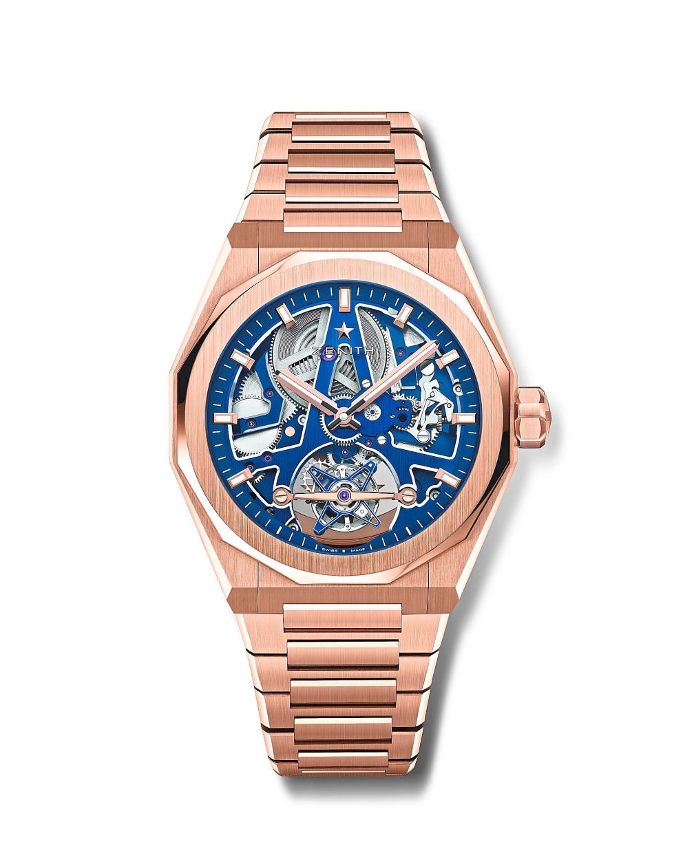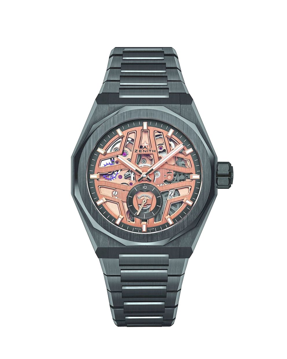 The main bridges of the movement also cleverly make up Zenith’s four-pointed star symbol, set off by the small seconds indicator at 6 o’clock.