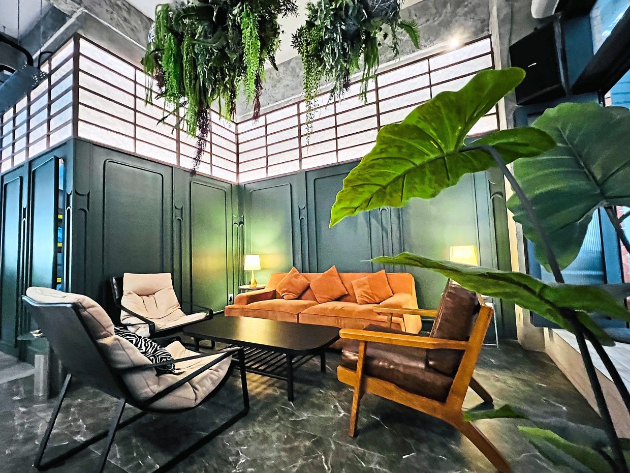 Standing in contrast against the concrete walls are dark green panelled ones that lend a touch of warmth and elegance, with plants dotted here and there tying the looks together and creating a cosy atmosphere.