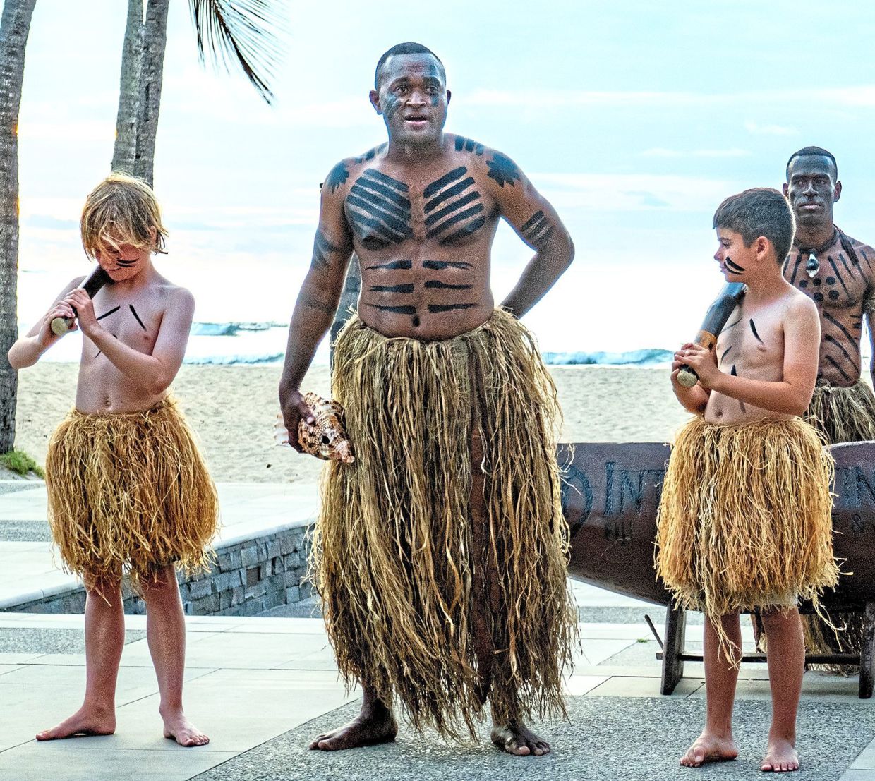 Young travellers joining Fijian warriors at a traditional torch-lighting ceremony on the beach.
