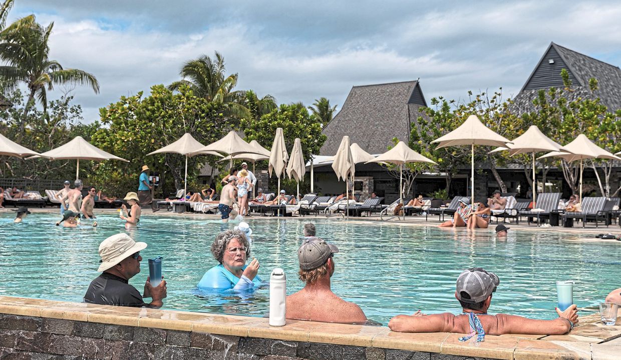 Families on vacation make new friends in the pool near the Toba Bar & Grill, Intercontinental Fiji Golf Resort & Spa.