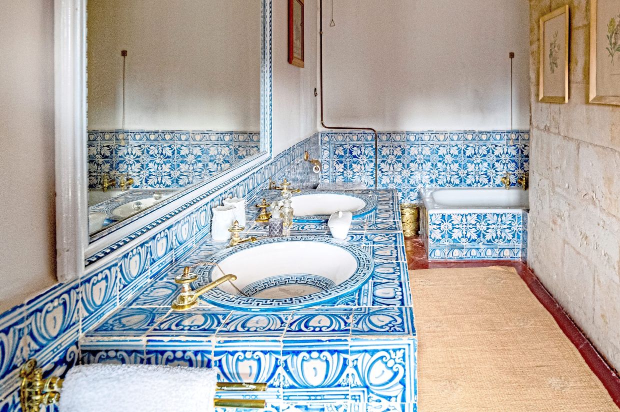 A bathroom, clad in 18th-century blue-and-white tiles, in the Palacio de Monterrey in Salamanca.