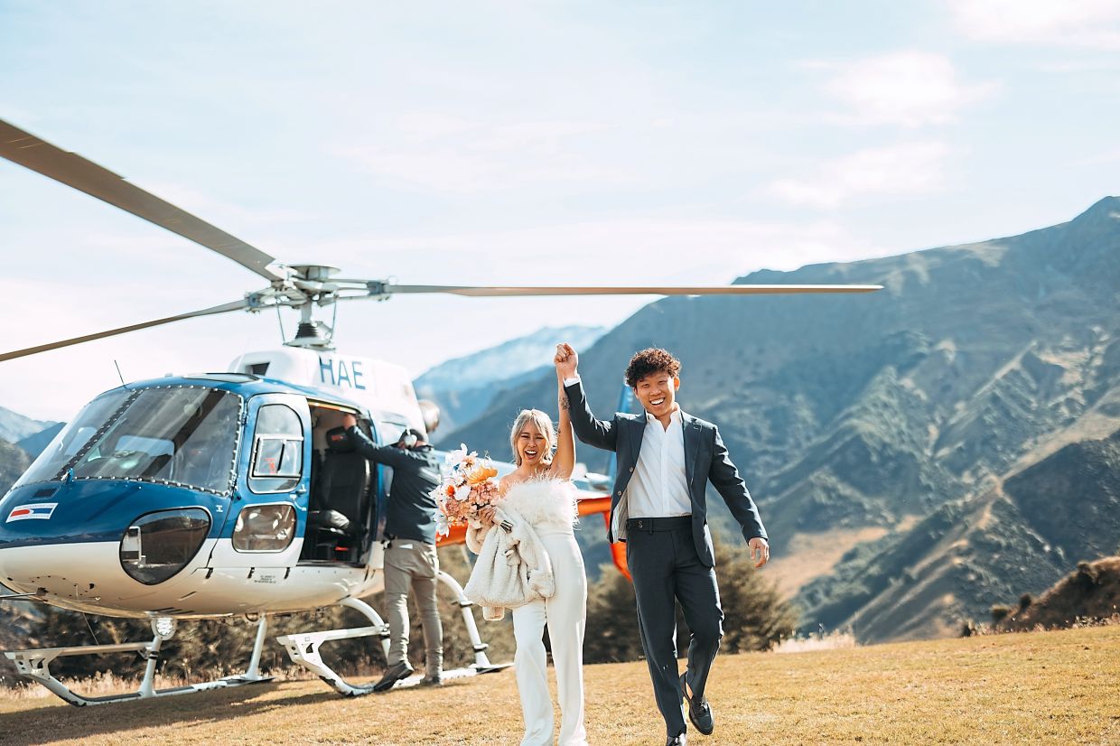 Cheong and Tan arriving by helicopter at their wedding venue in New Zealand. — STEPHEN YAU