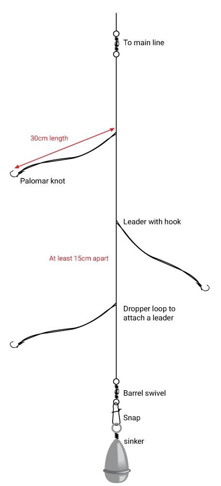 This rig uses a strong mainline with dropper loops for attaching hooks and a heavy sinker at the bottom.