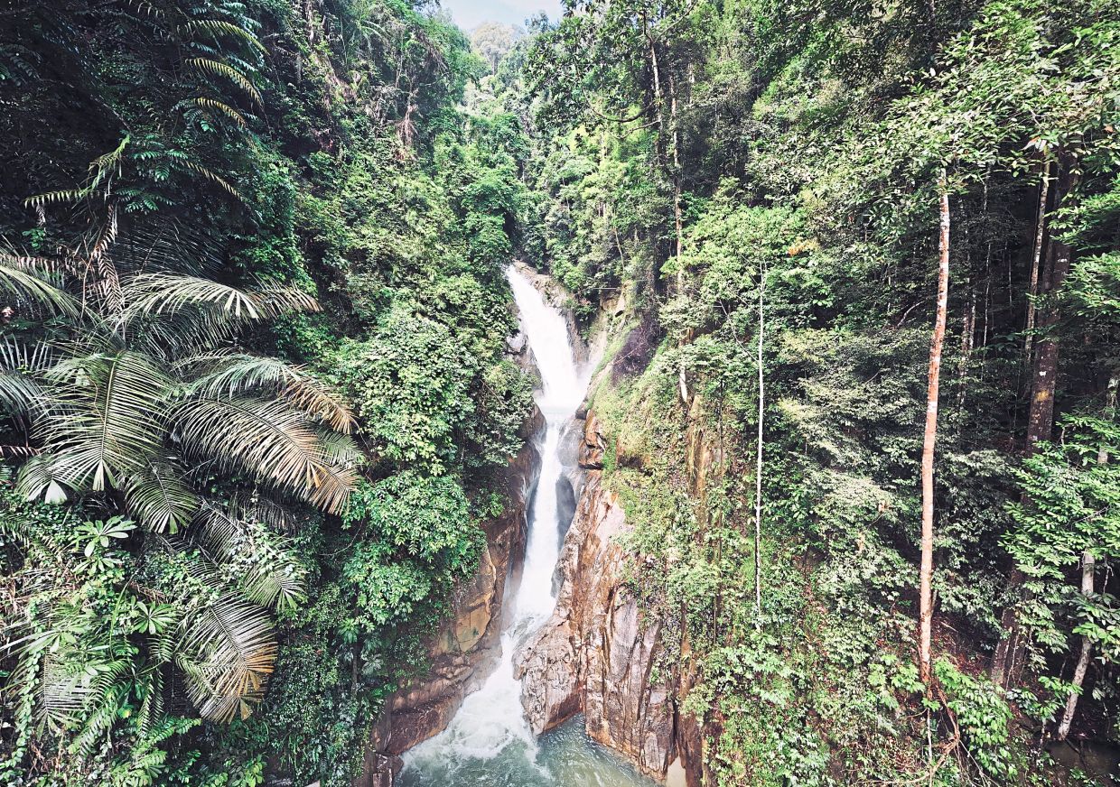 Emerging from the trail, you’re met by the magnificent sight of Chiling Waterfall, a three-tiered cascade plunging into a wide, natural pool surrounded by smooth boulders and mist-soaked jungle.