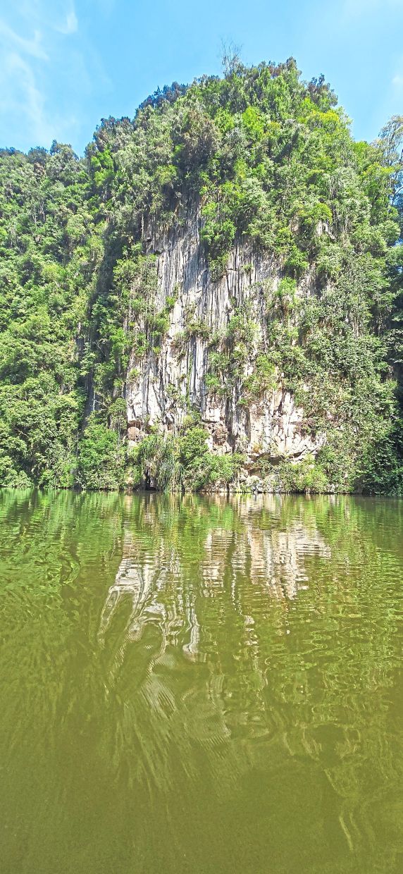 Encircled by cliffs that rise like ancient sentinels, thick with vines and trees clinging to every crevice, the water holds the sky in its palm.
