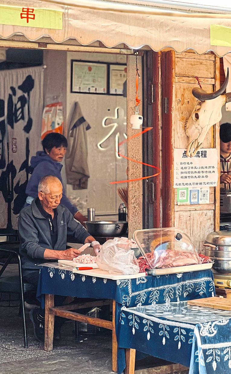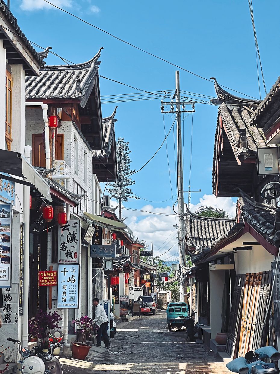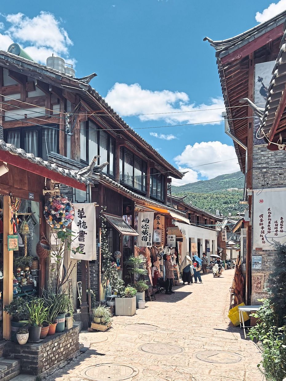 Fluffy morning clouds hung low, partially obscuring the mountain one afternoon. Walking along the cobblestone paths, we came across locals going about their everyday routines, manning their stores. This is a typical scene at Baisha Ancient Town.