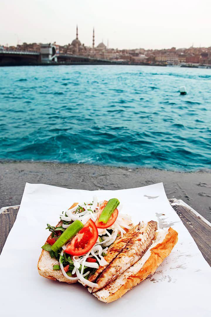 The popular street food typically uses Turkish bread, somun ekmegi, and sandwiched inside is a generous portion of grilled fish, topped with lettuce and onions, among others.