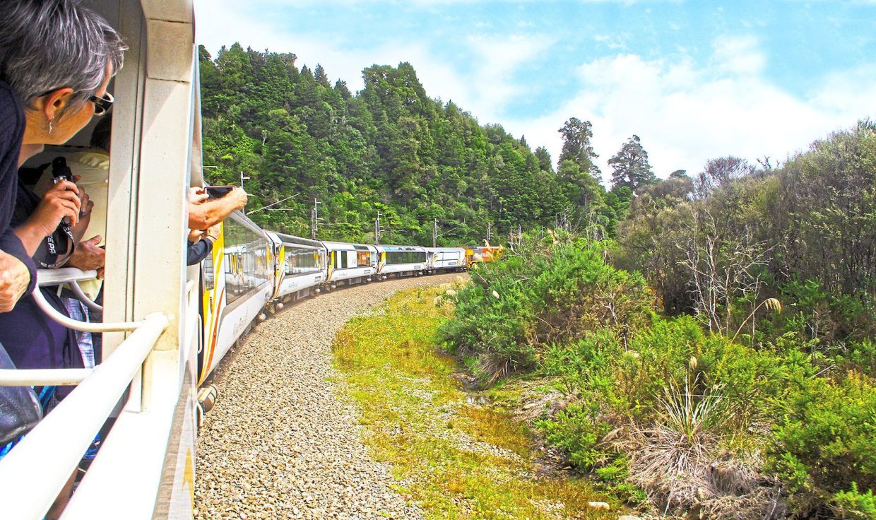 Admire the scenery from an open-sided car between Wellington and Auckland on the Northern Explorer in New Zealand.