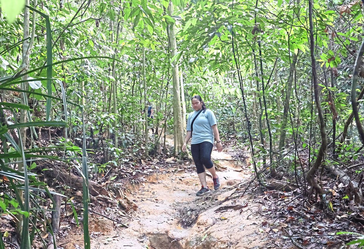 A popular tarred trail winds up and down, shaded by tall dipterocarp trees that filter the sunlight into soft, golden beams.