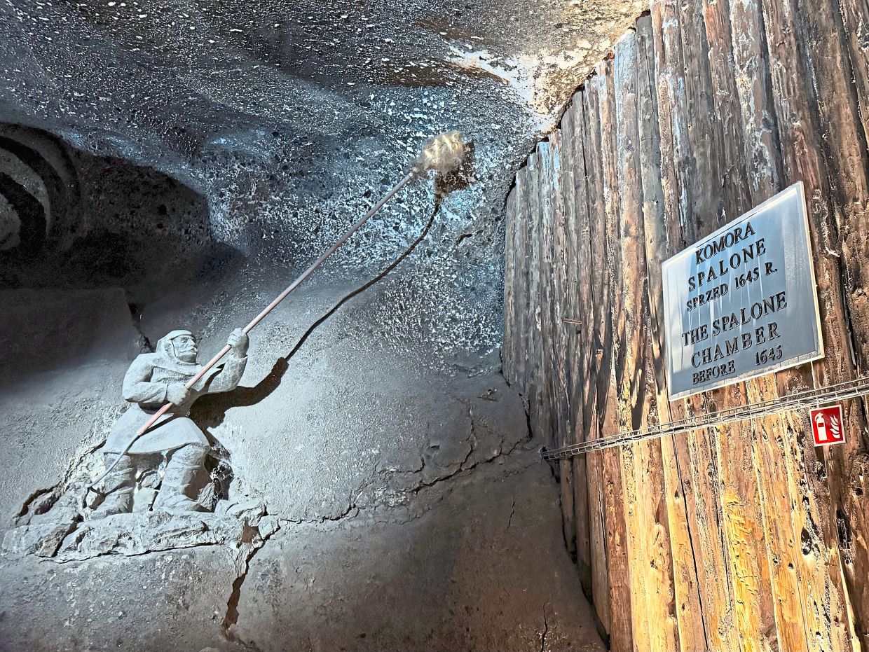 We descended a wooden staircase, going down more than 100m below the surface into a cave carved centuries ago in the Wieliczka Salt Mine.