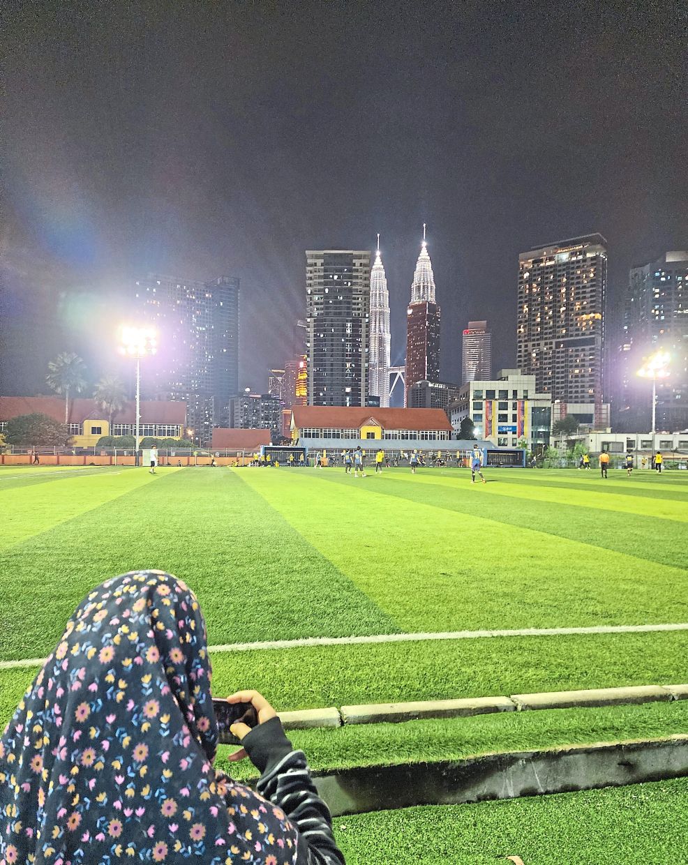 Exiting the building, we headed toward the brightly lit football field. It wasn’t just the practice match that caught our attention – standing tall in the background was the PETRONAS Twin Towers.