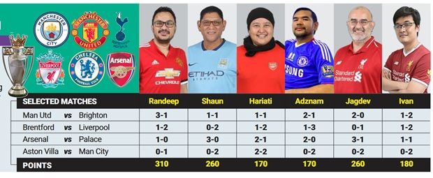 The Star’s Randeep Singh, Jagdev Singh, Ivan Loh, Hariati Azizan, Mohd Adznam and Shaun Orange pit their forecast expertise against each other in predicting the outcome of selected english Premier League matches each week.