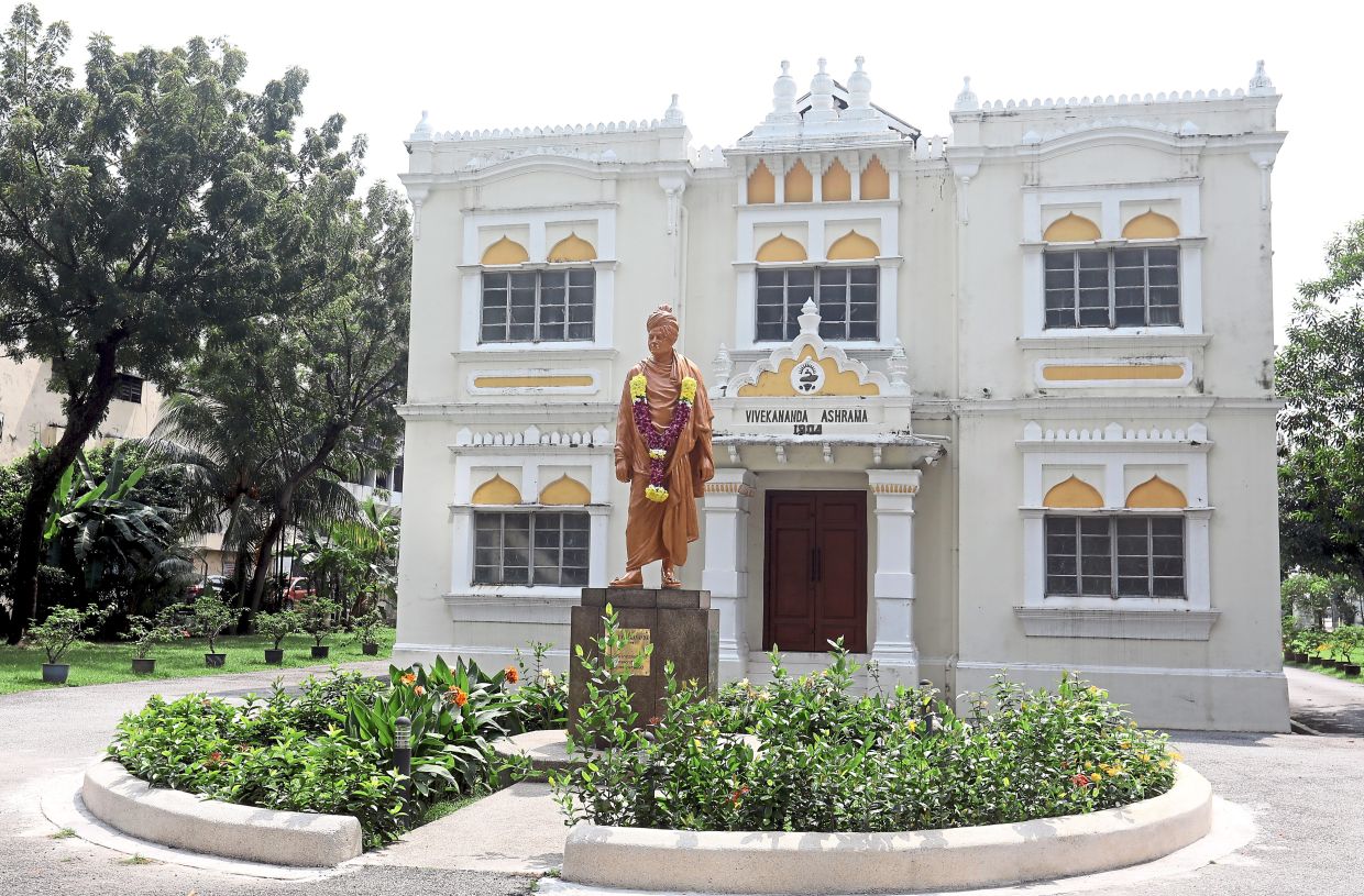 The bronze Vivekananda statue stands by the entrance of the ashram.