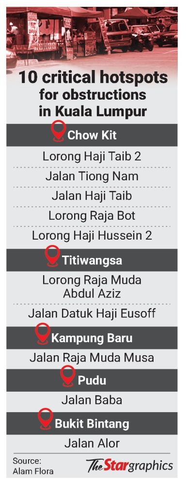 According to Alam Flora, the top 10 critical hotspots in Kuala Lumpur (see graphic) affected by obstructions impacting traffic flow, pedestrian movement, and accessibility were concentrated in Chow Kit, Titiwangsa, Pudu, Kampung Baru and Bukit Bintang.