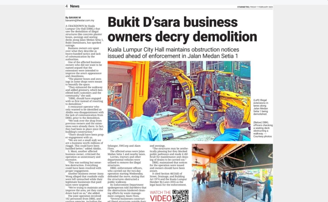 Her remarks come as StarMetro continues to highlight cases of illegal encroachment, where businesses have installed permanent fixtures including planters and storage units, or covering up drains and making it difficult for Alam Flora workers to carry out cleaning duties.