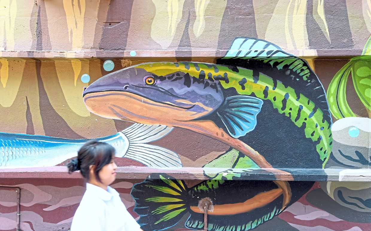Among the flora-and-fauna-themed murals are a frog looking out from lush green leaves, a variety of fish swimming in water and birds resting on trees.