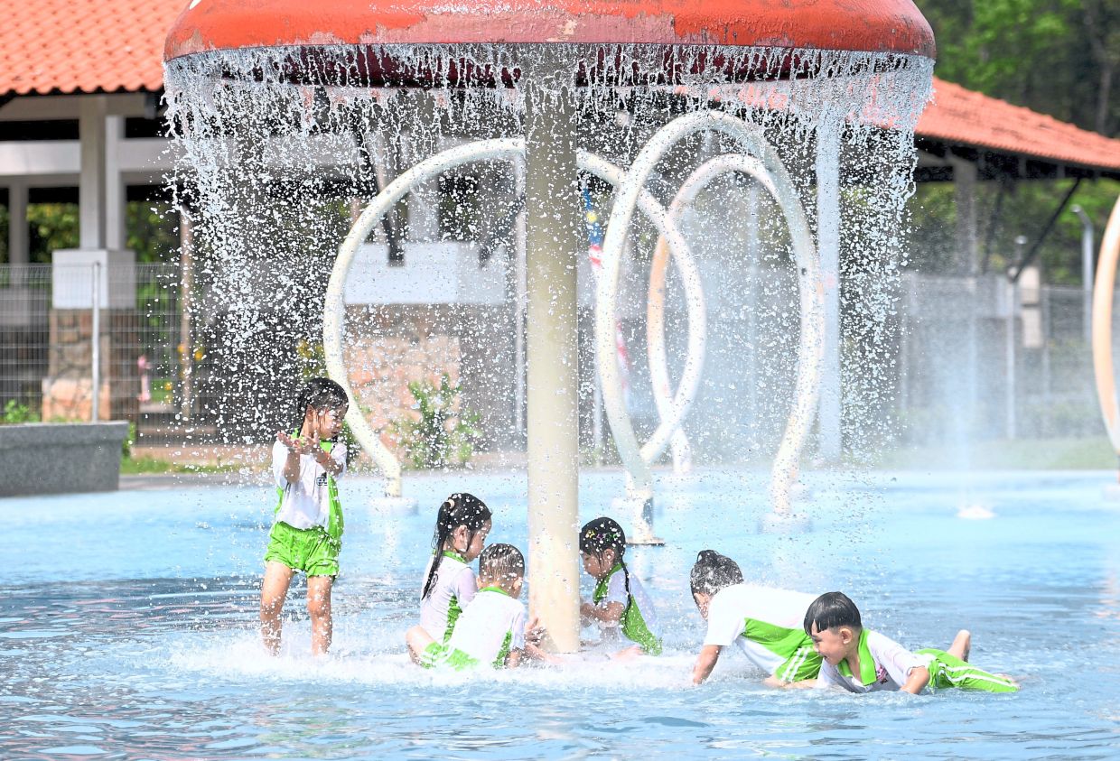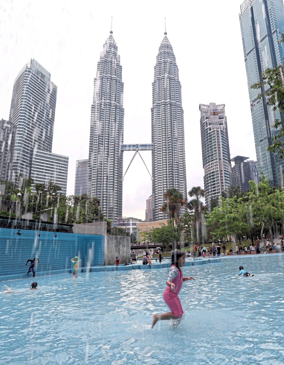 Many young children were spotted having a blast in the shallow public pools at Taman Tasik Titiwangsa and KLCC Park during the sunny weather.