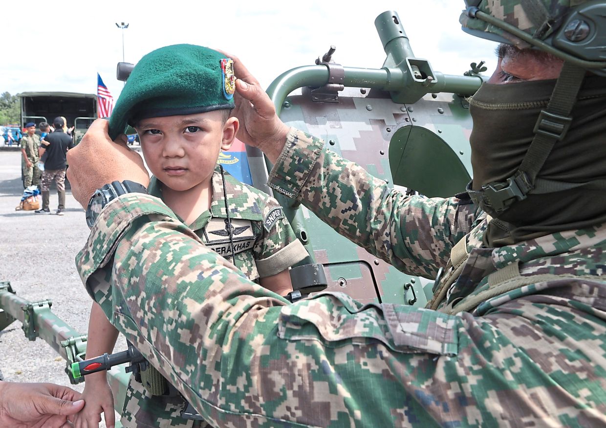 At a nearby exhibition, little ones clambered onto artillery units and posed on armoured carriers.
