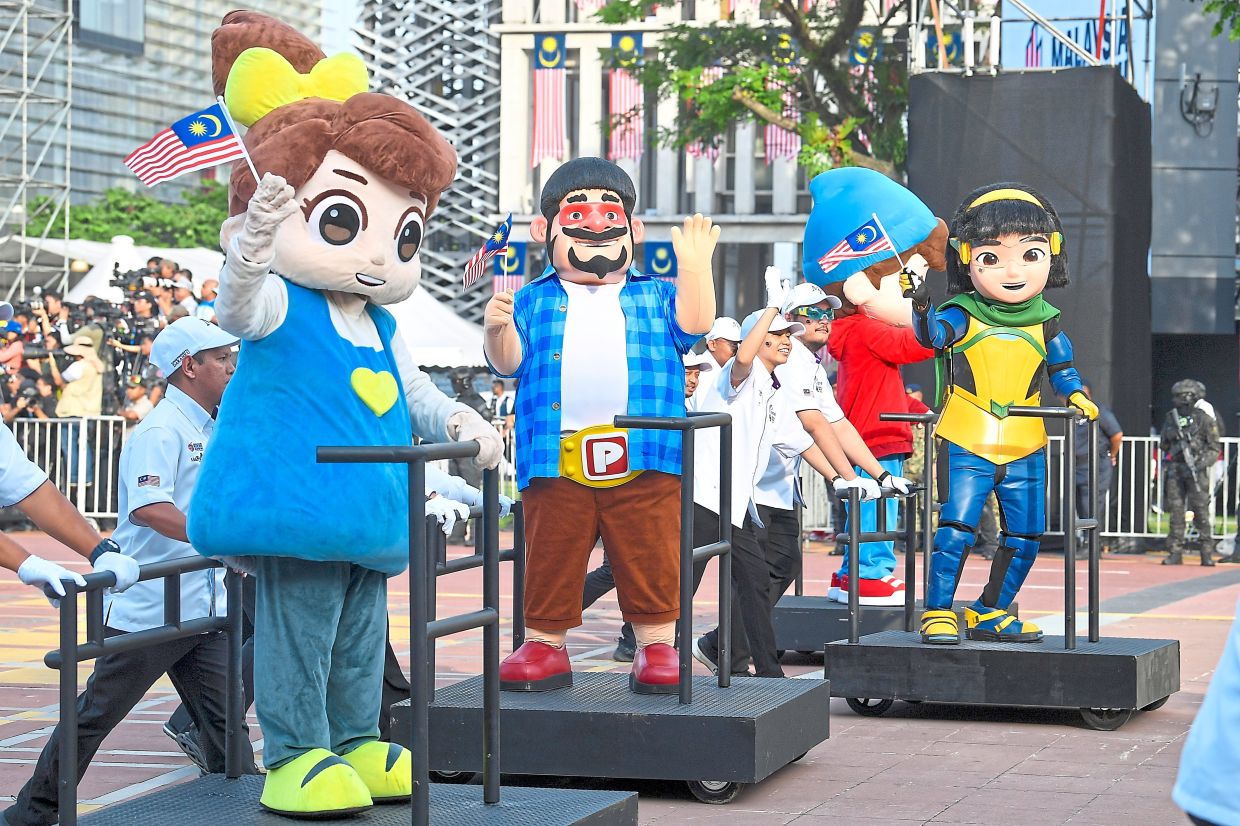 Animated characters in the flesh entertaining youngsters at the celebrations. From left are Hana, Papa Zola, Ejen Alicia and Omar. Left is Hana, rightmost is Omar. Omar&Hana animation. Second from left is Papa Zola (from Boboiboy series) Third from left is Ejen Alicia (from Ejen Ali).
