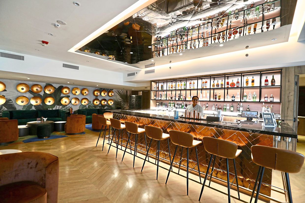 Softly lit stairs lead to the mezzanine floor of a hotel lounge that reveals a stylish yet cosy bar.