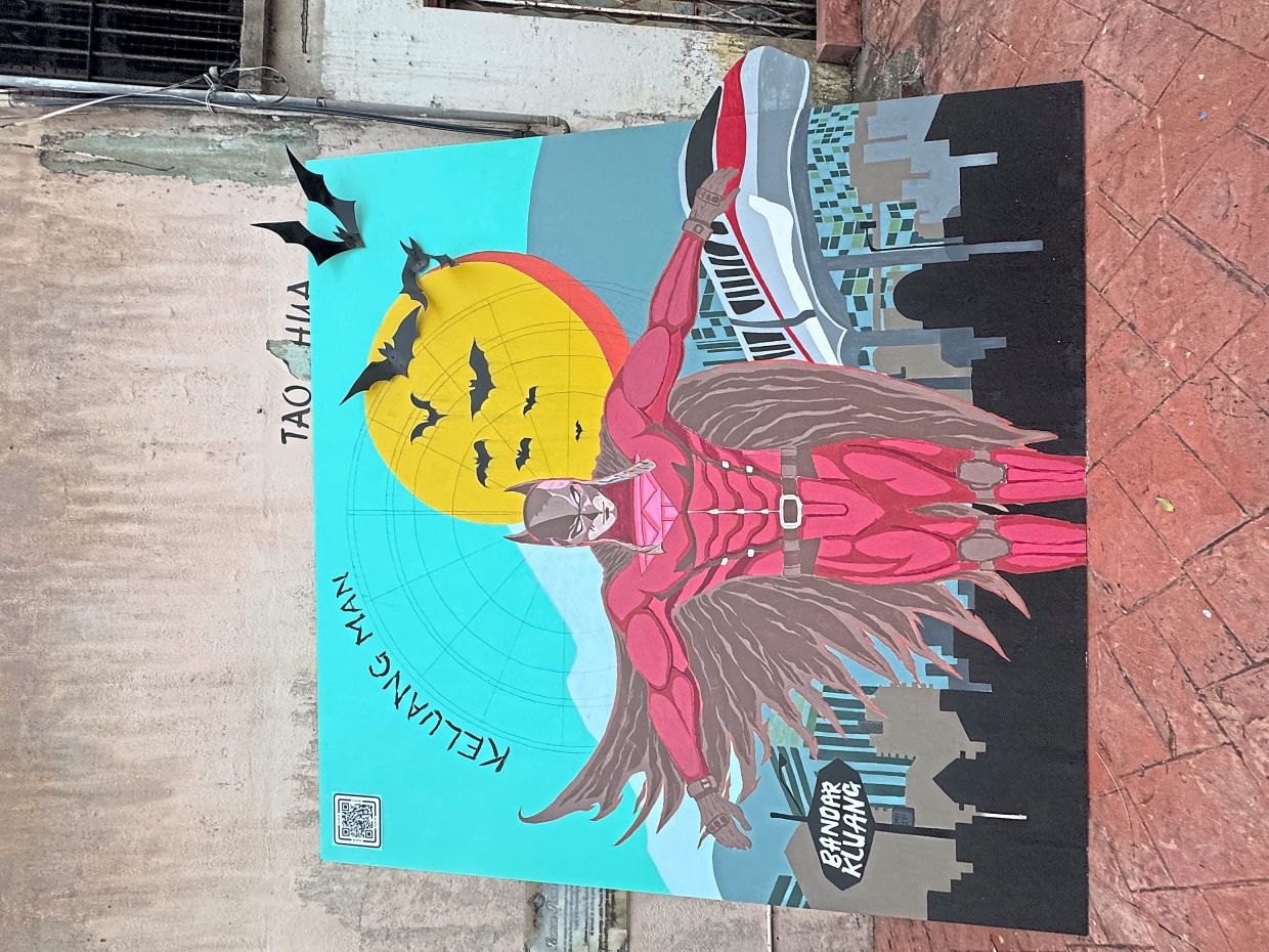 It illustrates key elements of the town’s identity – the fruit bat (keluang) from which the town gets its name, coffee, Gunung Lambak, and Kluang clock tower – and pays tribute to the town’s history, noting the railway service that began in 1909.