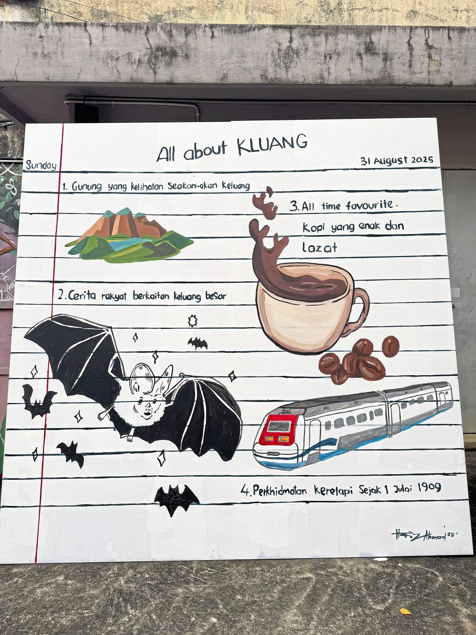 Another mural, styled like a page from an exercise book, presents a simplified “All about Kluang” overview.