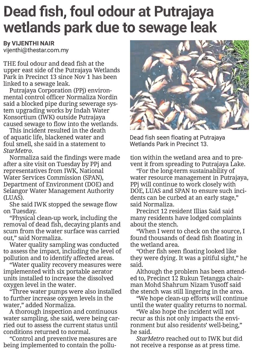 The national sewerage company said this in response to the Nov 8 StarMetro report titled “Dead fish, foul odour at Putrajaya Wetlands Park due to sewage leak”.