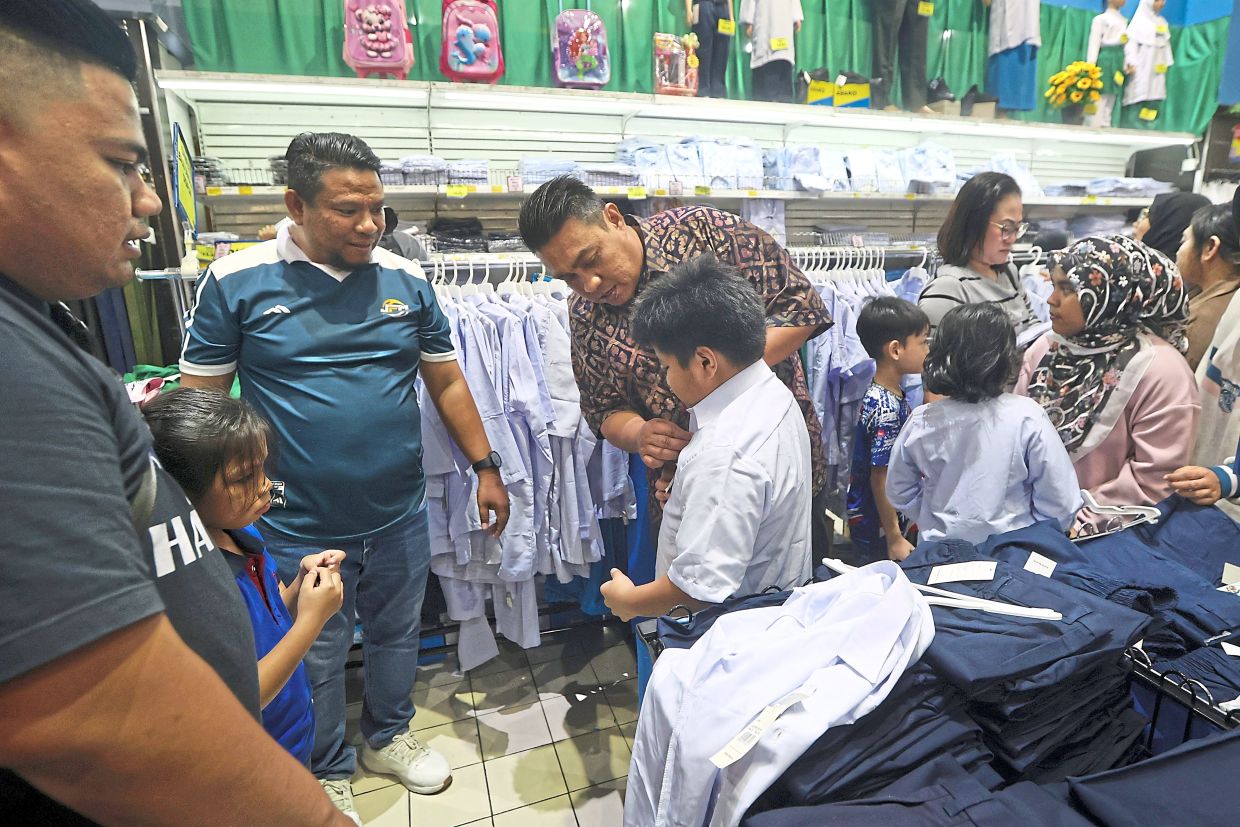 Above: Families looking at backpacks as part of their shopping list for the new school term. Below: Ku Mustapa (in batik shirt) helping a youngster try on a school uniform under MBPJ’s back-to-school aid programme in Subang Jaya. — Photos: CHAN TAK KONG/The Star