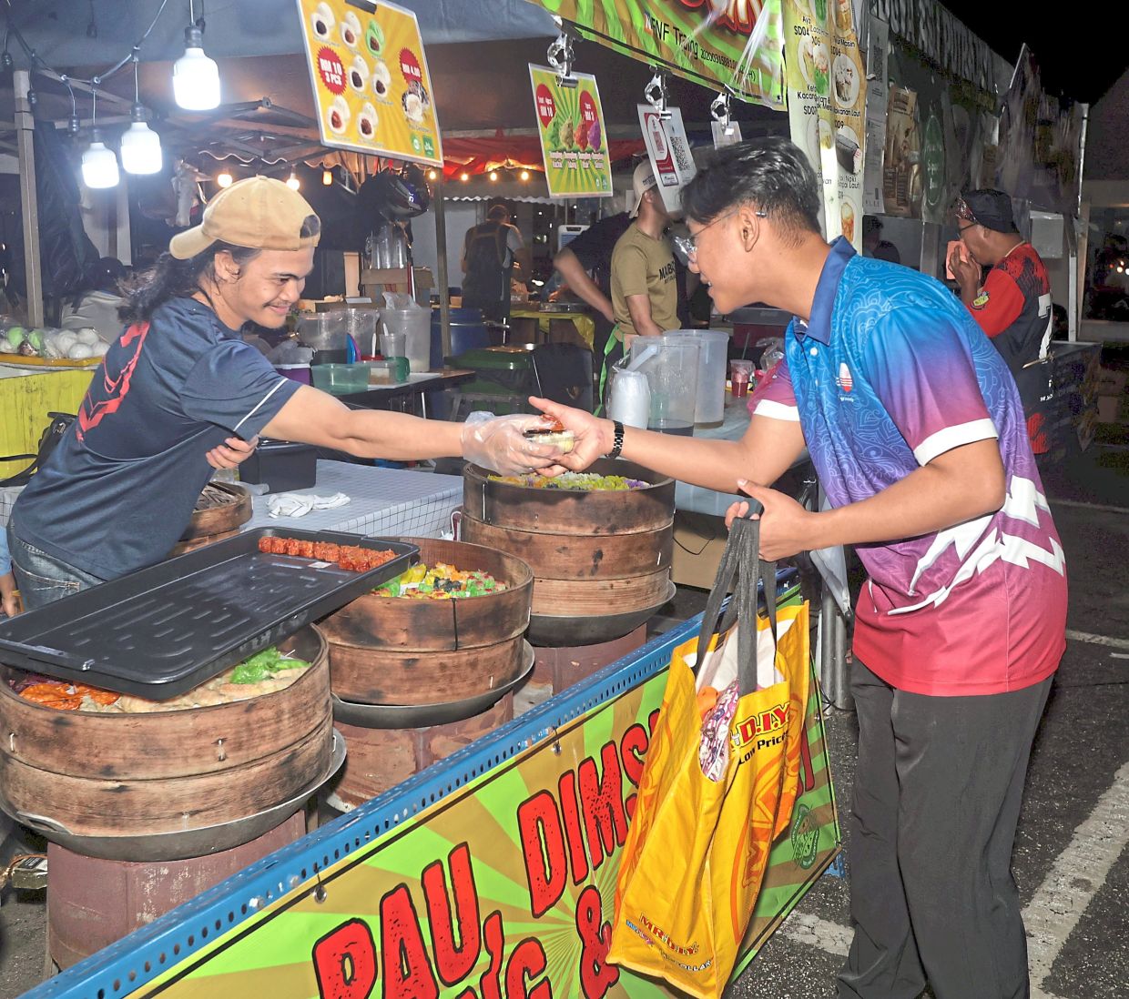 At the Ramadan bazaar in Precinct 3, a group of university students ate quickly before darting through the bazaar’s 280 stalls, collecting unsold food and drinks from traders who were packing up for the day.