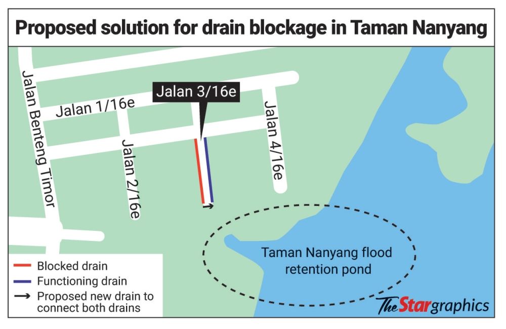 “A new drain will be built to connect the drain neighbouring Jalan 2/16e to the drain neighbouring Jalan 4/16e, so that the water has one extra path to flow into the retention pond.
