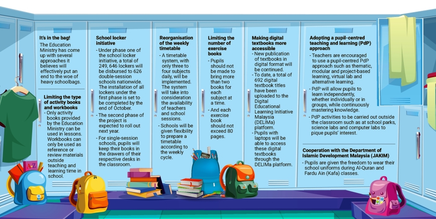 Other measures taken to solve the issue of heavy schoolbags included the reorganisation of timetables to fit only three to four subjects a day and giving schools the flexibility to provide a timetable according to a weekly rotational system.