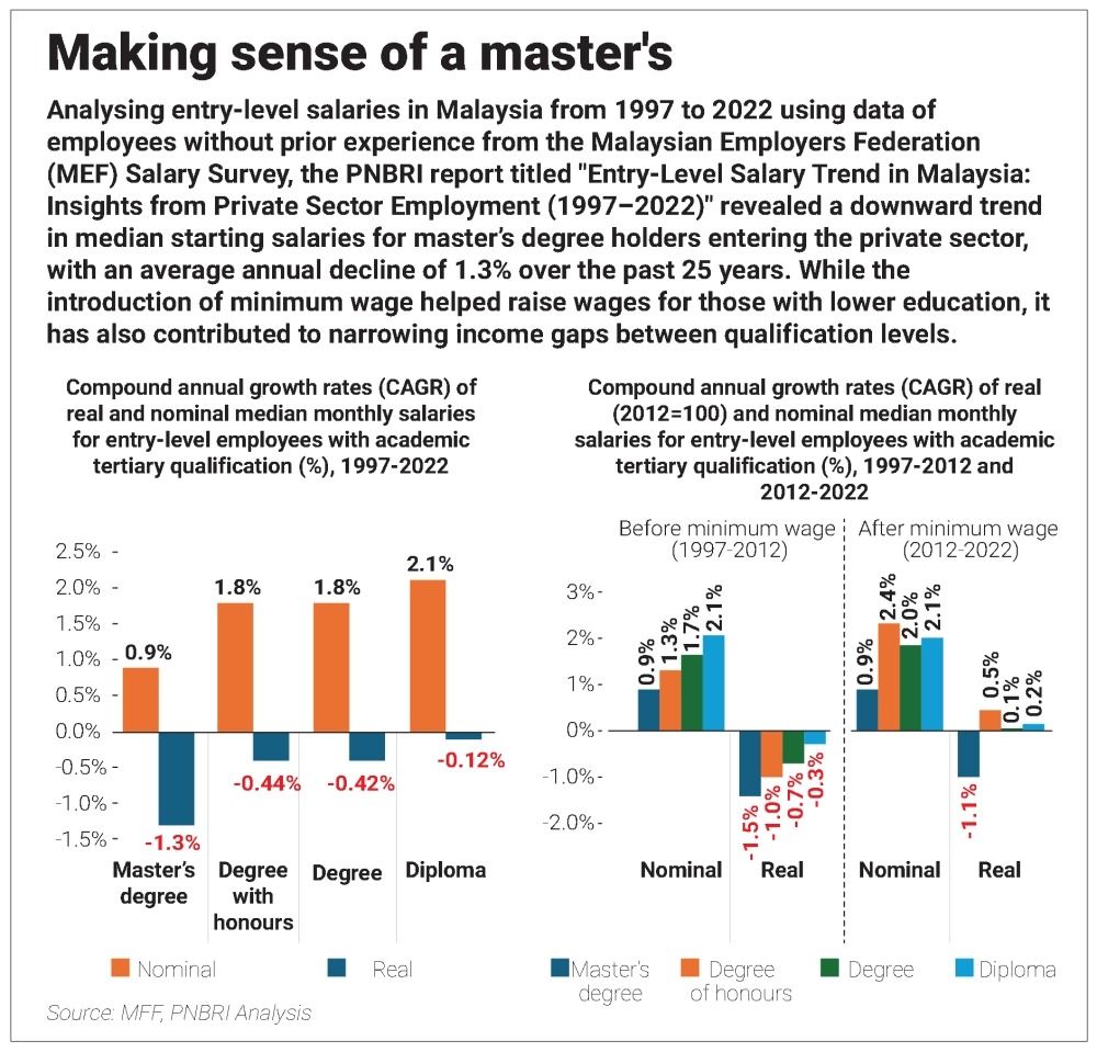 However, a 2025 report by PNB Research Institute (PNBRI) found that although graduates of higher qualifications have been earning more in absolute terms year upon year, the growth of the entry-level salaries has been slower – especially for master’s degree holders (see infographic).