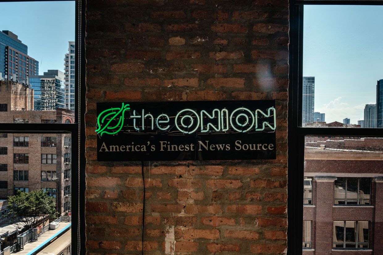 A fluorescent sign for The Onion hangs on a wall at the company's headquarters in Chicago, Aug. 12, 2024. (Jamie Kelter Davis/The New York Times)