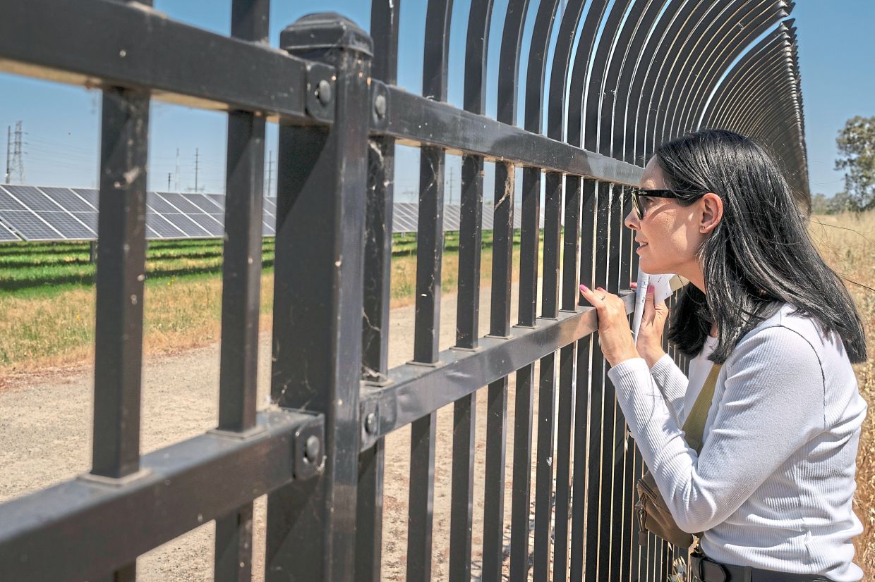 Rebecca Hernandez, an associate professor of ecology at University of California Davis, looks through the fencing at the Wildflower Solar Farm in Rio Linda.