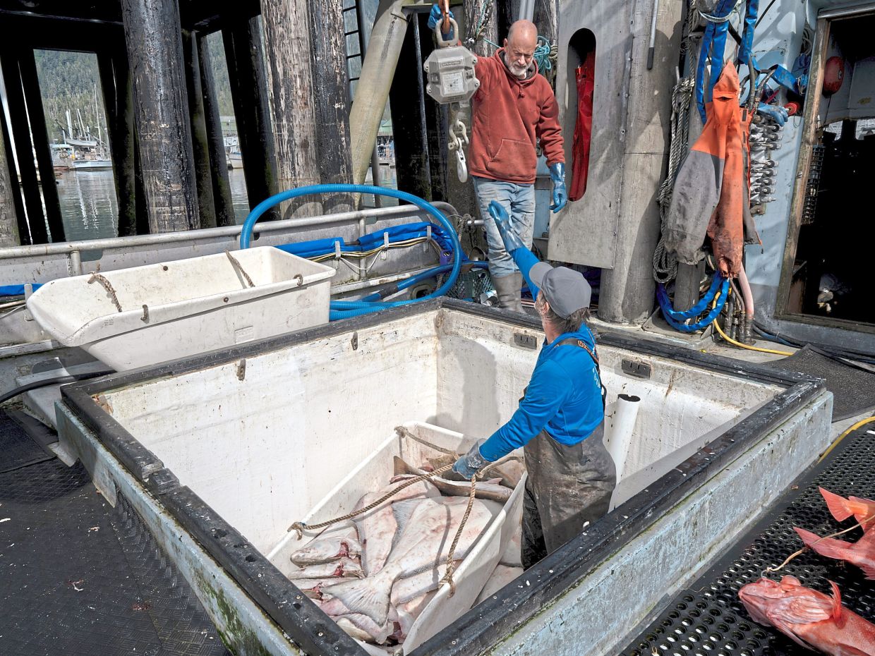 George Wood and his son Karsten unload a catch of halibut at Coastal Cold Storage, which serves the tiny minority of fishermen who market their fish directly to consumers in Petersburg.