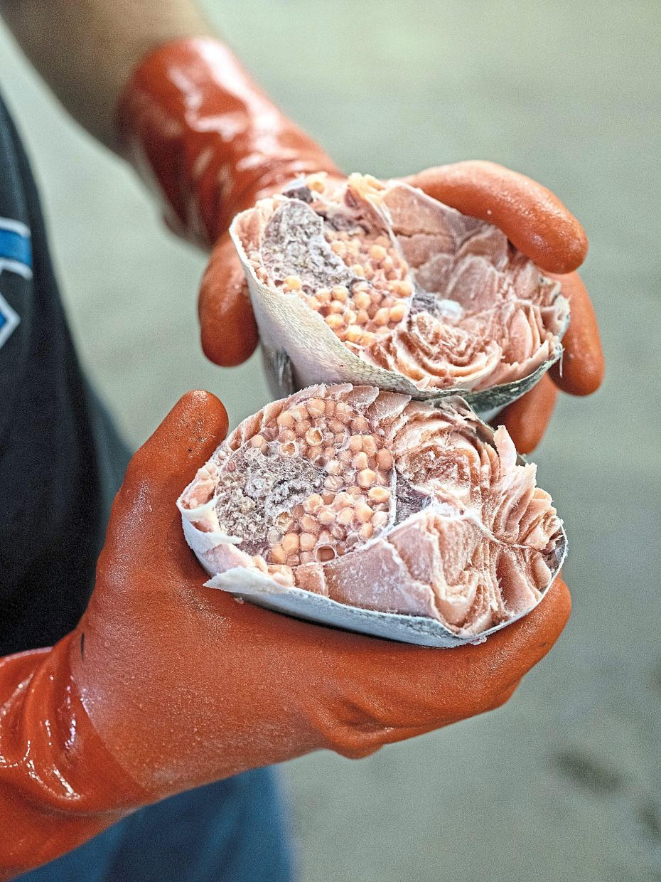 A production manager checking for proper freezing holds a salmon he broke in half at Circle Seafoods.