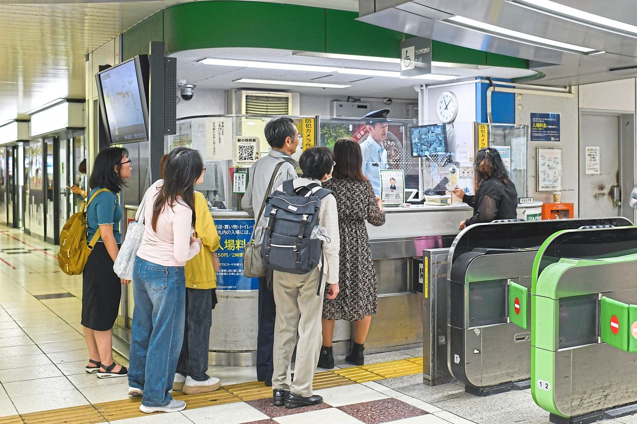 Commuters speak with workers at Ikebukuro Station in Tokyo on Friday, June 21, 2024. (Noriko Hayashi/The New York Times)