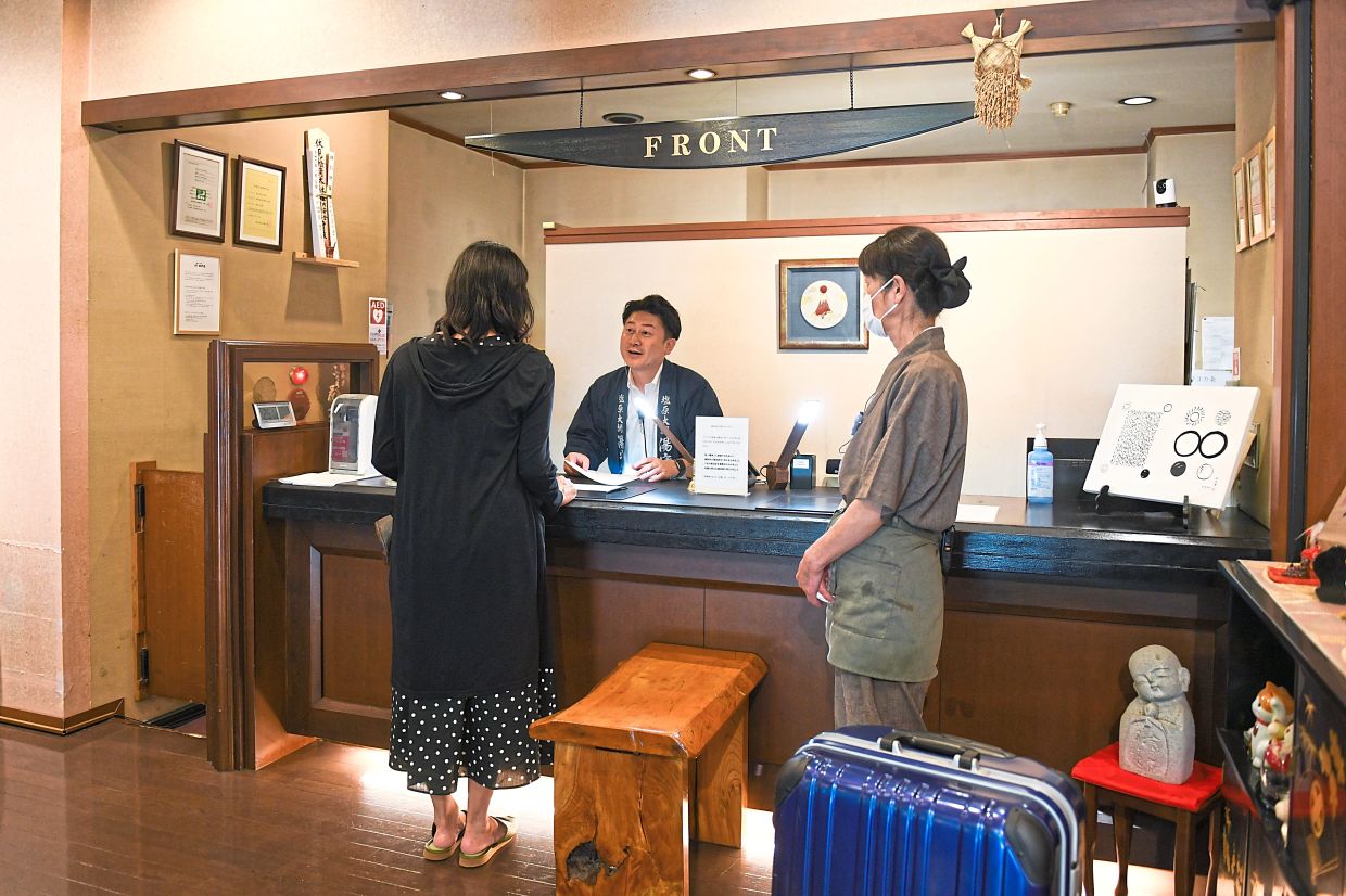 Yuji Tanaka, senior managing director of Yumori Tanakaya Hotel, talks with guests at the reception desk in Nasushiobara, Tochigi, Japan, on Saturday, June 29, 2024. (Noriko Hayashi/The New York Times)