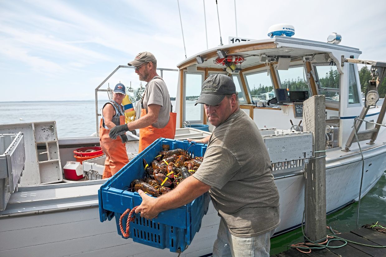Dale Combs (right), dock manager for Fifield Lobster, helping to unload freshly caught lobster after a day of fishing in Stonington. — ©2024 The New York Times Company