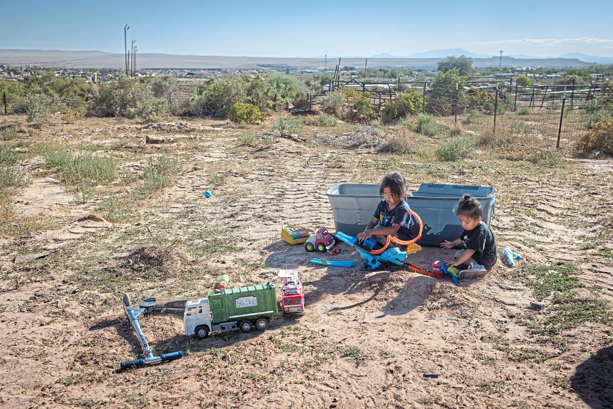 Native American children playing in the harsh landscape. Around one in three Navajo households live below the poverty line, and the desert winds whip up more dust than construction sites ever would. — Photos: ©2024 The New York Times Company