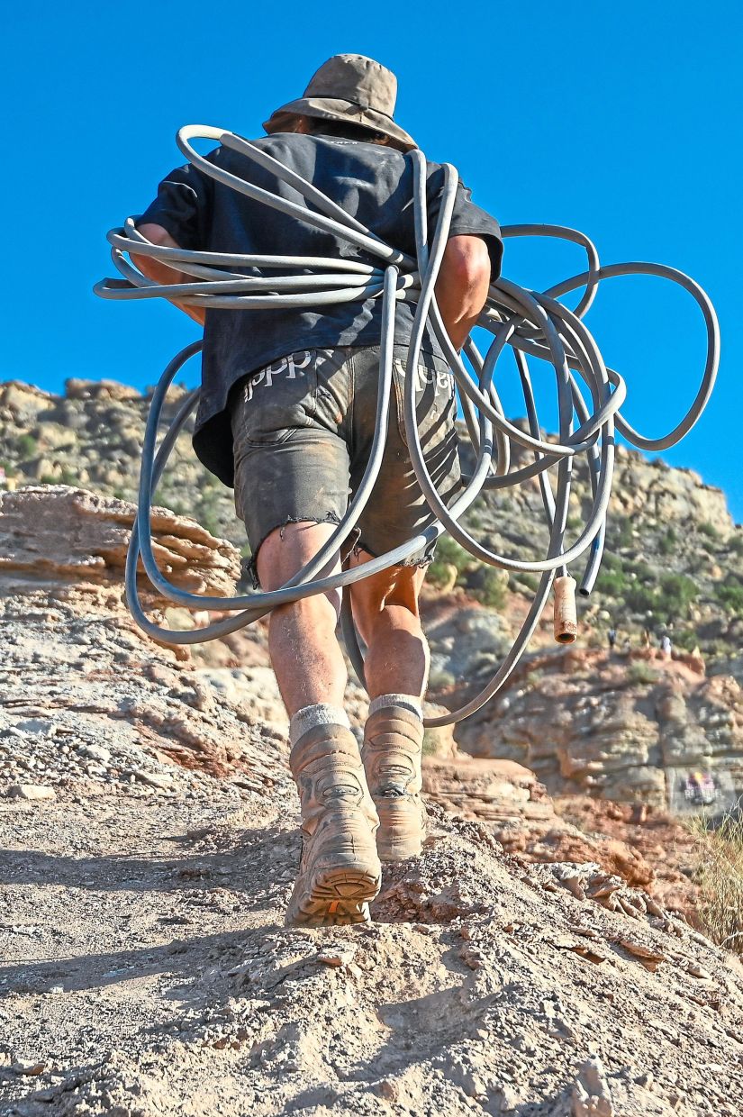 A crew member carrying a hose to the top of the course during the final practice day at Red Bull Rampage in Utah. — ©2024 The New York Times Company